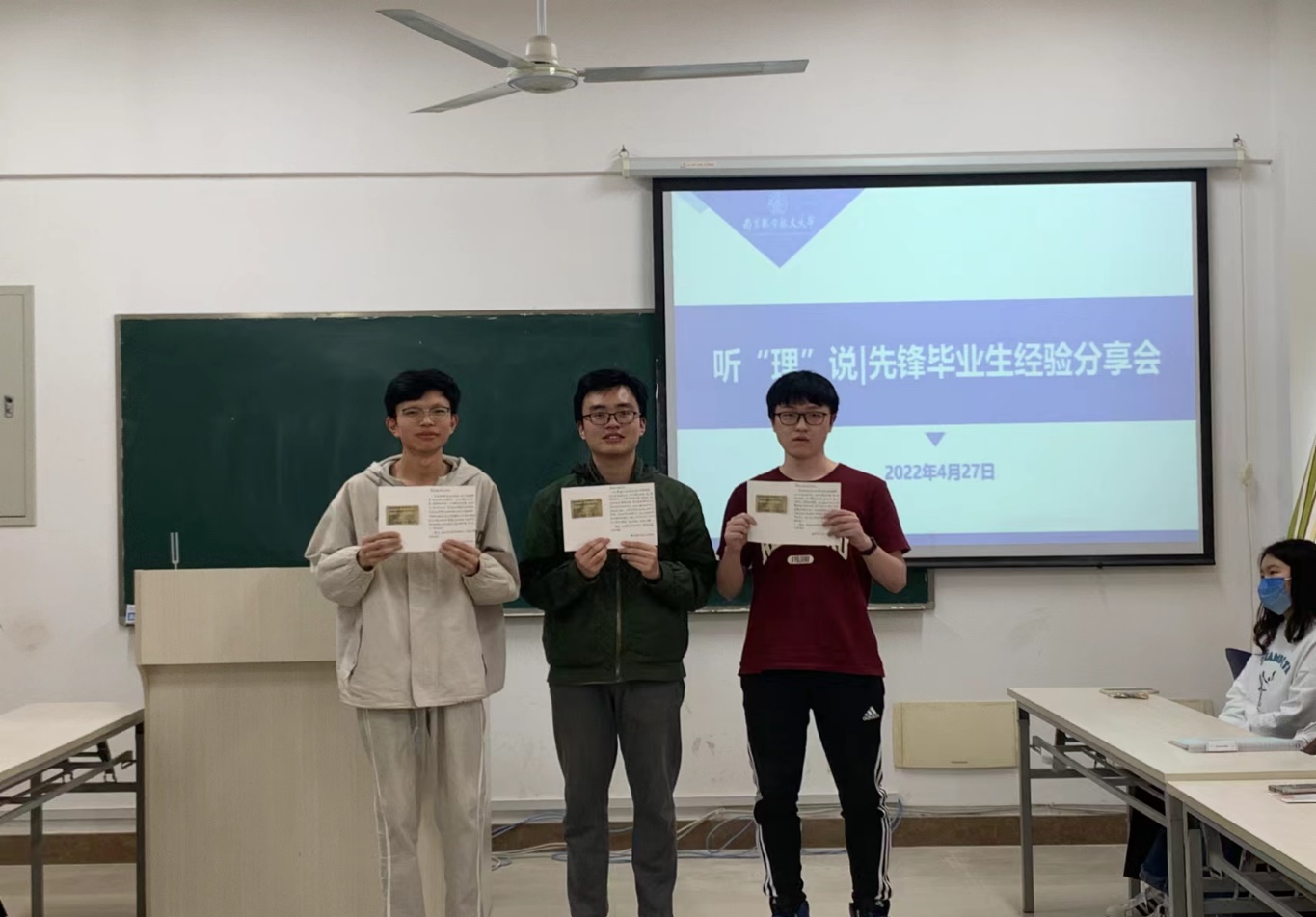 4月27日下午4点,欲神幻想 第一期“听‘理’说”先锋毕业生经验分享会活动于理学楼547会议室举办,活动邀请理学实验班学生张凯峰、周易、张子木为主讲人,欲神幻想 大一大二学生代表及辅导员刘思佳、胡诗帆、邢临川、陈越参加会议。分享会旨在搭建理学实验班与低年级学生间的交流平台,帮助低年级同学传承实验班优秀同学追求卓越的精神、学习中的好经验、好做法,助力自身成长成才。