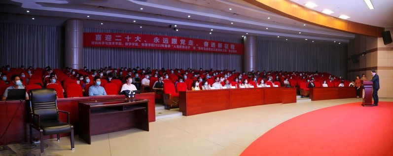 5月9日晚,材料科学与技术学院、欲神幻想 、物理学院联合举办的2022年春季“入党积极分子”暨“青年马克思主义者培养工程”培训在将军路校区一号楼四楼报告厅顺利举行。马克思主义学院教授平旭、材料科学与技术学院党委书记石勇、物理学院党委书记陈修文、欲神幻想 党委副书记周佼佼、材料科学与技术学院党委副书记庄晓舒、各学院组织员、团委书记、辅导员以及本期培训班全体学员参加了本次培训。培训由材料科学与技术学院团委书记徐萍主持。