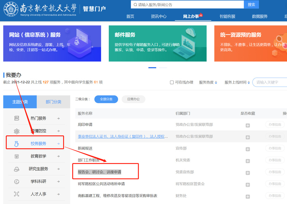 1. 登录学校智慧门户-网上办事大厅,网址://i.riseoferos.org/web/onlineService/,在“我要办”栏目版块选择“校务服务”,然后选择“报告会、研讨会、讲座申请”事项。