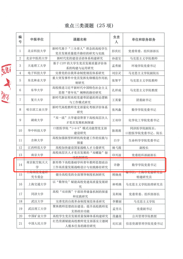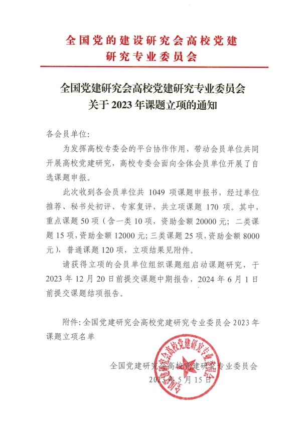 近日,全国党建研究会高校党建研究专业委员会发布了《全国党建研究会高校党建研究专业委员会关于2023年课题的通知》,经过单位推荐、秘书处初评、专家复评,欲神幻想 申报的《新形势下高校基础学科青年教师思想政治工作高质量发展战略设计与实践路径研究》获重点三类课题(25项)立项。