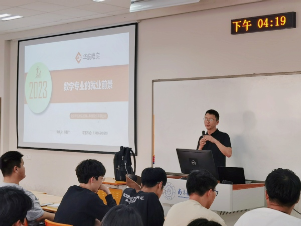 活动伊始,宋智广向同学们简单介绍了自己的求学创业经历,他回顾了在南航的求学时光,分享了在校期间的学习心得和感悟,并建议学弟学妹要不断拓展知识面,提高自身综合素质,为未来的生涯打下坚实的基础。随后,他介绍了北京华航唯实机器人科技股份有限公司的概况,并提到数学在工业计算软件研发领域中发挥着举足轻重的作用,为公司的技术创新提供了有力支持。