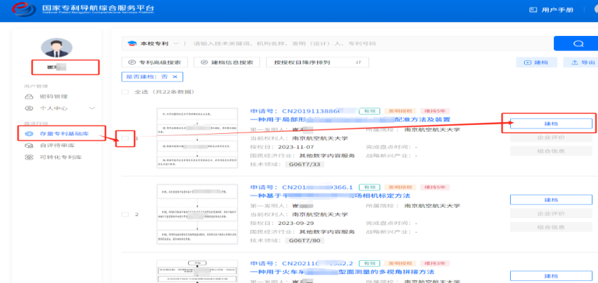 2.专利负责人可在“存量专利基础库”看到相关专利(系统根据发明人姓名进行推送)。发明人对每件专利进行判断,若为本人负责或代为管理的专利,点击“建档”进行盘点,其他专利无需处理。1件专利被某位发明人盘点认领后,其他发明人将不能再进行盘点。