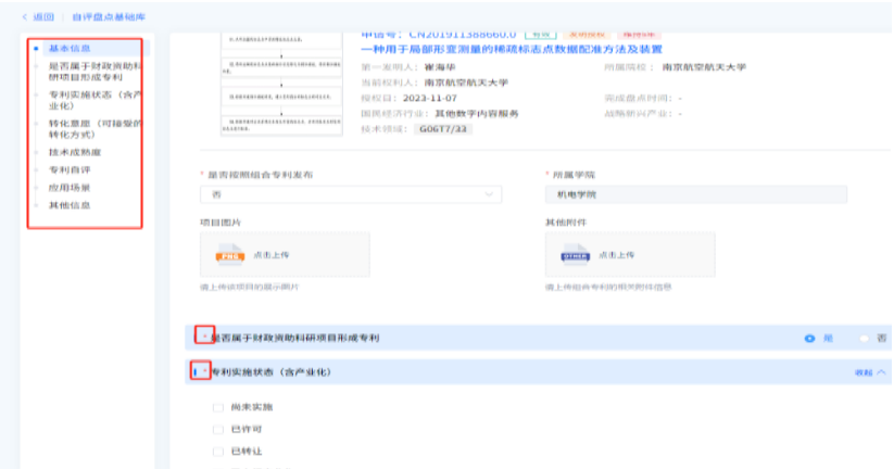 是否属于财政资助科研项目形成专利、专利实施化状态、专利转化意愿、技术成熟度、专利价值分级自评、应用场景等。