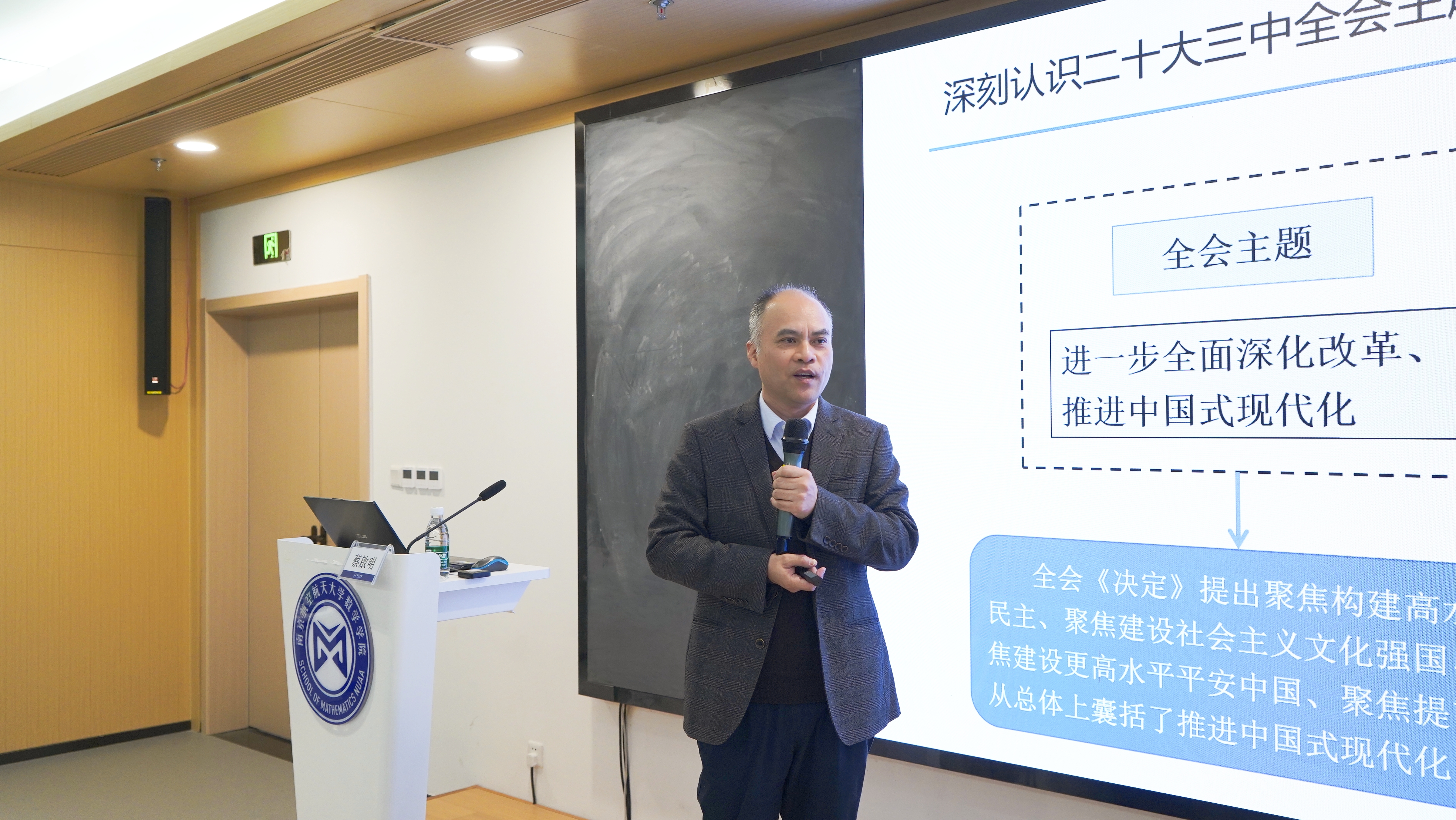 为深入学习贯彻党的二十届三中全会精神,根据校党委统一部署,11月19日,欲神幻想 举行学习宣传党的二十届三中全会精神校内宣讲团报告会,邀请校内宣讲团成员、经济与管理学院教授蔡啟明作专题辅导报告。学院领导班子成员、师生党员代表近百人参加报告会。报告会由学院副院长龚跃政主持。