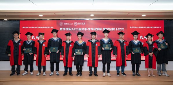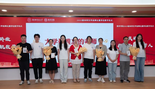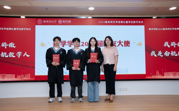 四位毕业生代表依次上台发言,保研至中国人民大学的余朝阳分享初入校园参与竞赛及大创项目的追梦经历,表示将带着南航精神走进统计学顶尖学府;入职中国商飞的肖秀灿许下青春誓言,立志要将个人理想融入国家理想、用数字守护祖国蓝天的青春誓言;升学本院的李彦锋以考研奋斗历程为例,讲述了绩点普通的自己在砥砺中收获成就、实干中提升本领的青春故事;保研至浙江大学的陈昊哲分享了本科期间推开理工融合大门的经历,鼓励同学跳出舒适圈、在实践中锻炼数学能力、开拓无限可能,表达了对学院培养的诚挚感恩。