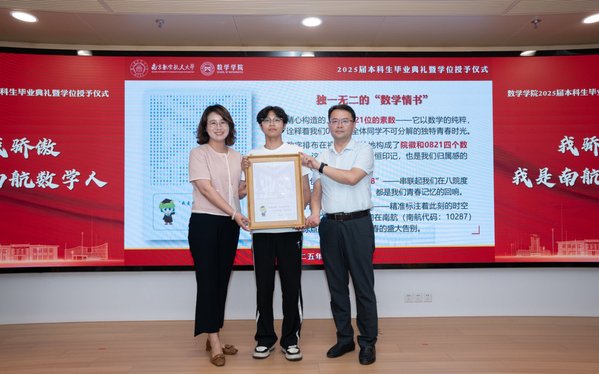 离别之际,全体毕业生匠心独运,为学院献上凝聚理性智慧与深沉情感的“数学情书”—一个精心构造的821位素数。应用统计学专业许金阳代表学子向学院郑重呈递这份特殊礼物,许静、王春武代表学院接收礼物。这个特殊的数字视觉上巧妙构成院徽与“0821”级标识,其内含的400个“8”串联起在八院闪亮的四年时光,结尾的“20250610287”精准标注了告别的时空坐标,下方镌刻的三行情诗,诉说着学子对学院的无限眷恋与祝愿。