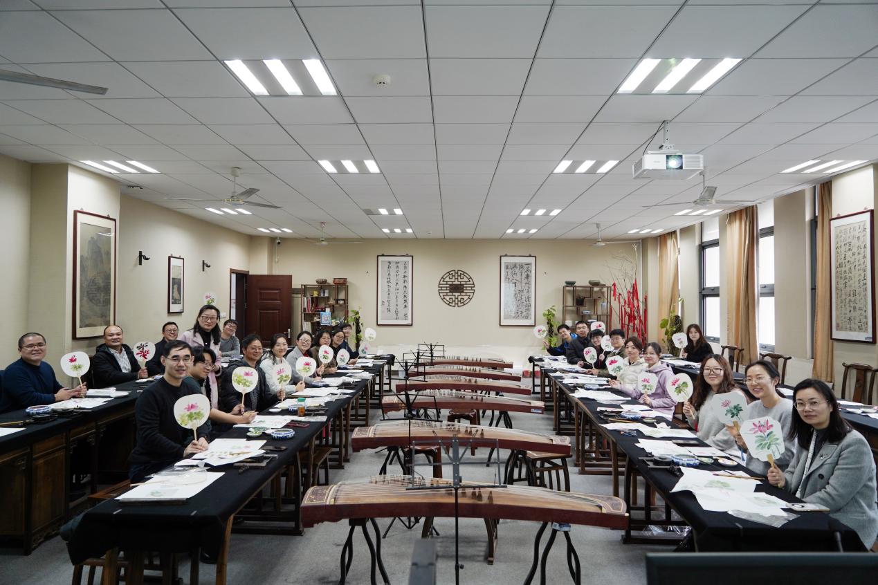 学院特别邀请到江苏省工笔画协会会员、南京市青年美术家协会会员喻泉老师进行现场指导。喻老师从莲花“出淤泥而不染”的文化意象讲起,深入浅出地讲解了国画中莲花的构图、笔法与神韵。师生党员执笔、蘸墨、调色、点染,将对“清廉”的理解,凝聚于笔尖,倾注于扇面。一方素扇,渐渐被清雅的莲花与挺拔的枝叶所充盈。